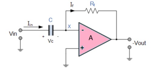 Theory: In the differentiator circuit the input is connected to the the inverting output of the Op-Amp through a capacitor(C) and a negetive feedback is provided to the inverting input terminal through a resistor(Rf), which is same as an integrator circuit with feedback capacitor and input resistor being replaced with each other. Here the circuit performs a mathematical differentiation operation, and the output is the first derivative of the input signal, 180′ out of phase and apmlified with a factor Rf*C. The capacitor on the input allows only the AC component and restrict the DC, at low frequency the reactance of capicitor is very high causing a low gain and high frequency vice varsa but and high frequency the circuit becomes unstable.