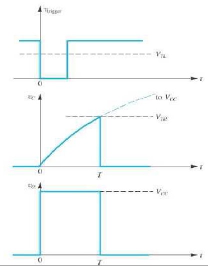 When this happens, the555 output goes high. This causes the capacitor to be charged until it reaches 6.67V. Then,the timing interval ends, the output goes low, and the capacitor is discharged through the”dis”input.The capacitor in front of the trigger input causes the mono-stable to be negative-edgetriggered. If the capacitor is replaced with a wire, and the logic input is held low too long,then the 555’s output will start to oscillate
